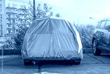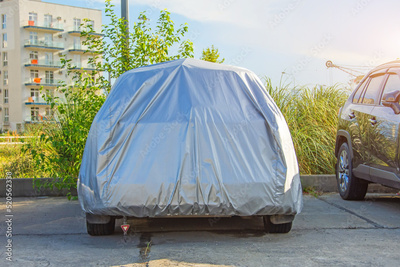 The car is covered with a protective cover from the effects of rain and snow in the parking lot, storage secured parking.
