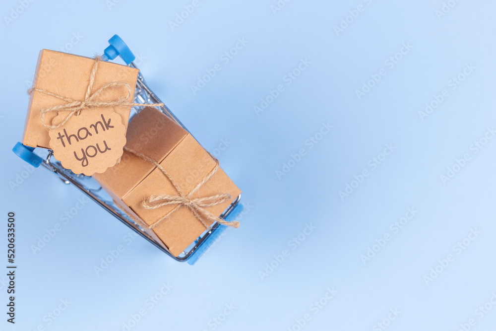 Mini shopping cart on light blue background. Kraft paper boxes with tag inscription Thank you inside trolley. Top view. E-commerce, online shopping concept