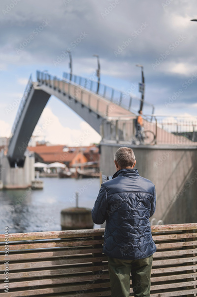 attractive old man walking in the city lifestyle portrait with Tonsberg viewpoint