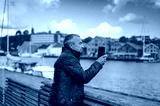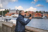 attractive old man walking in the city lifestyle portrait with Tonsberg viewpoint