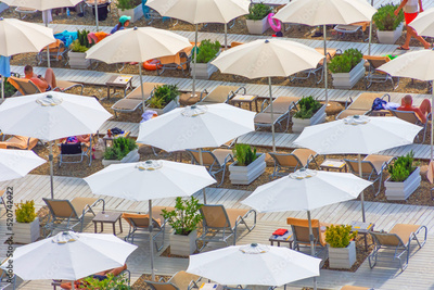 Umbrellas and sun loungers with walking paths and flowerpots with plants on the beach.