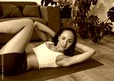 Close up of young woman doing crunches in living room with cat