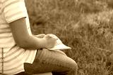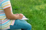Close up of child hand, writing on notebook outdoor, abstract blurred green natural background. Child studying in garden. education, writing hobby concept