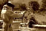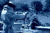 Beekeeper removing honeycomb from beehive. Person in beekeeper suit taking honey from hive. Farmer wearing bee suit working with honeycomb in apiary. Organic farming. Copy-space