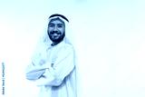 an arabian young man in a turban standing smiling with crossed hands on a plain background