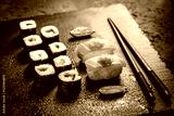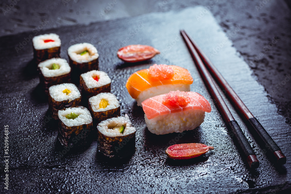 Assortment of vegan sushi with vegetables, seitan, Konjac plant, tofu as fish substitudes, with finger lime as caviar on black
