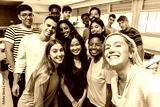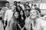 United multiracial big group of student friends taking selfie with teacher at college - Teenage high school people having fun together in classroom - Youth lifestyle, education and community concept