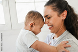 Young latin mom having fun with her son in bed at home - Soft focus on mother eye