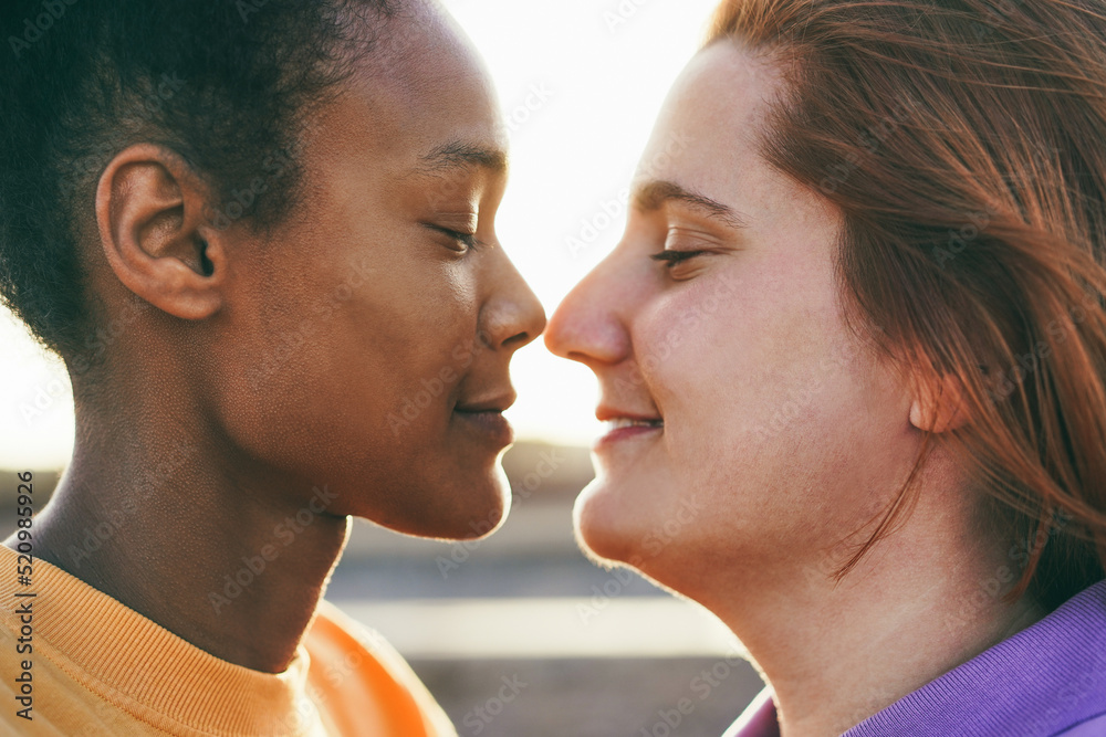 Happy women gay couple having tender moment outdoor - Lgbt and love concept
