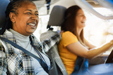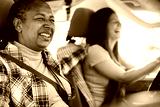 Multiracial senior female having fun on the road in camper van - Travel concept - Focus on african woman face
