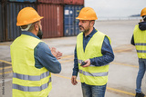 Workers controlling shipping containers at industrial port outdoor - Focus on right man face