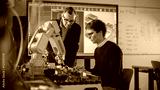 Product Supervisor Consults Young Engineer Working with Optimization of Robot Arm. People Doing Robotic Hand Maintenance Ideas. High-Tech Science and Engineering Concept. Medium Shot