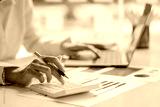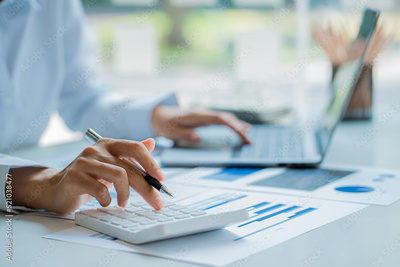 An accountant, businessman or financial professional presses calculators, computes, analyzes graphs, business reports, and financial charts at the office. economic concepts, finance, market research