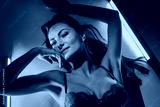 beautiful girl in neon light lies on the floor. Mixed Colorful Light Concept.