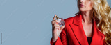 Woman presents perfumes fragrance. Woman with perfum bottle. Woman holding a perfumes bottle
