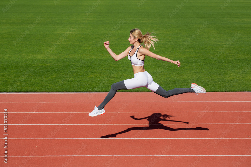 Woman running during. Sport backgrounds. Runner. Professional sportswoman during running training session. Woman running jump on stadium track. Sportswoman in sportswear jumping