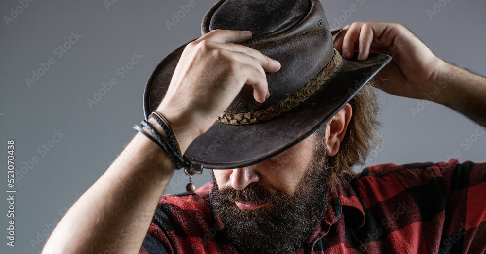 American cowboy. Leather Cowboy Hat. Portrait of young man wearing cowboy hat. Cowboys in hat. Handsome bearded macho