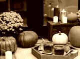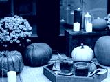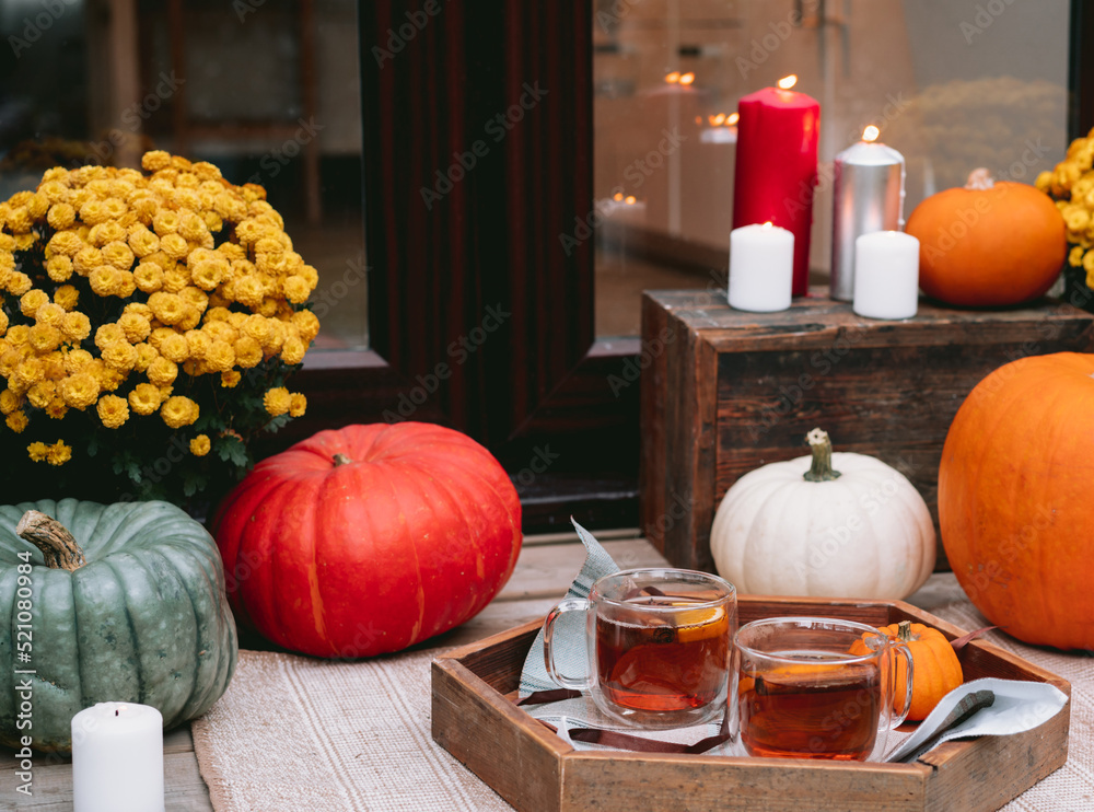 Wooden tray with spiced tea on the porch of the house decorated with pumpkins, flowers, and candles. Cozy home entrance decorated for autumn holidays. Spend time at home. The date at home