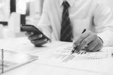 Young Asian startup businessman using smartphone to analyze online marketing information.