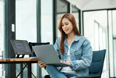 Young programmer or IT specialist satisfied with her work done..