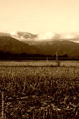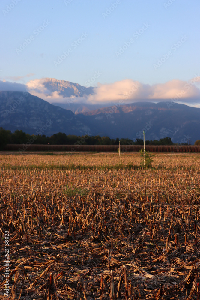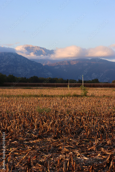 Cut corn field on a sunny autumn day. Harvested agricultural corn field