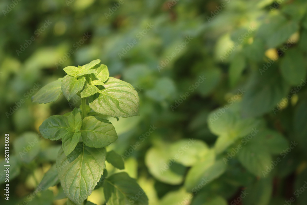 Sprig mint plant growing in the garden. Mentha rotundifolia on summer