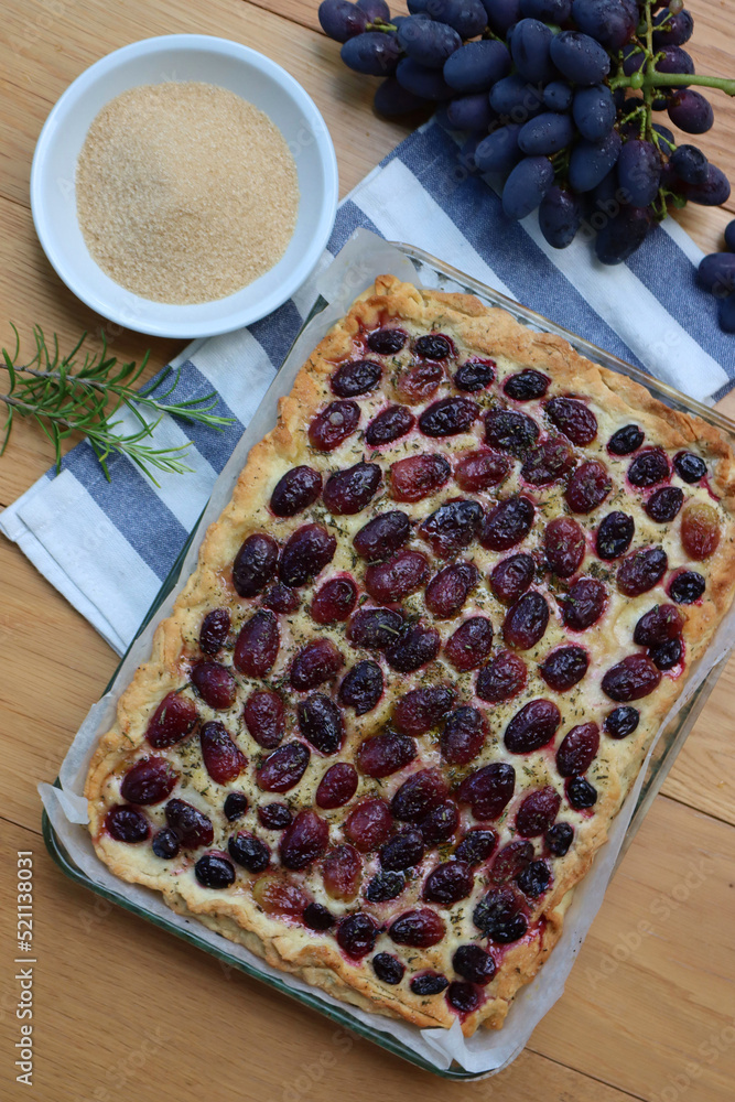 Italian Focaccia bread with sweet black grape and rosemary on a wooden table. Traditional dessert from Tuscany in Italy called “schiacciata con l'uva”