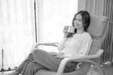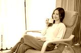 Beautiful and relaxed young Asian female sipping coffee while sitting in her armchair.