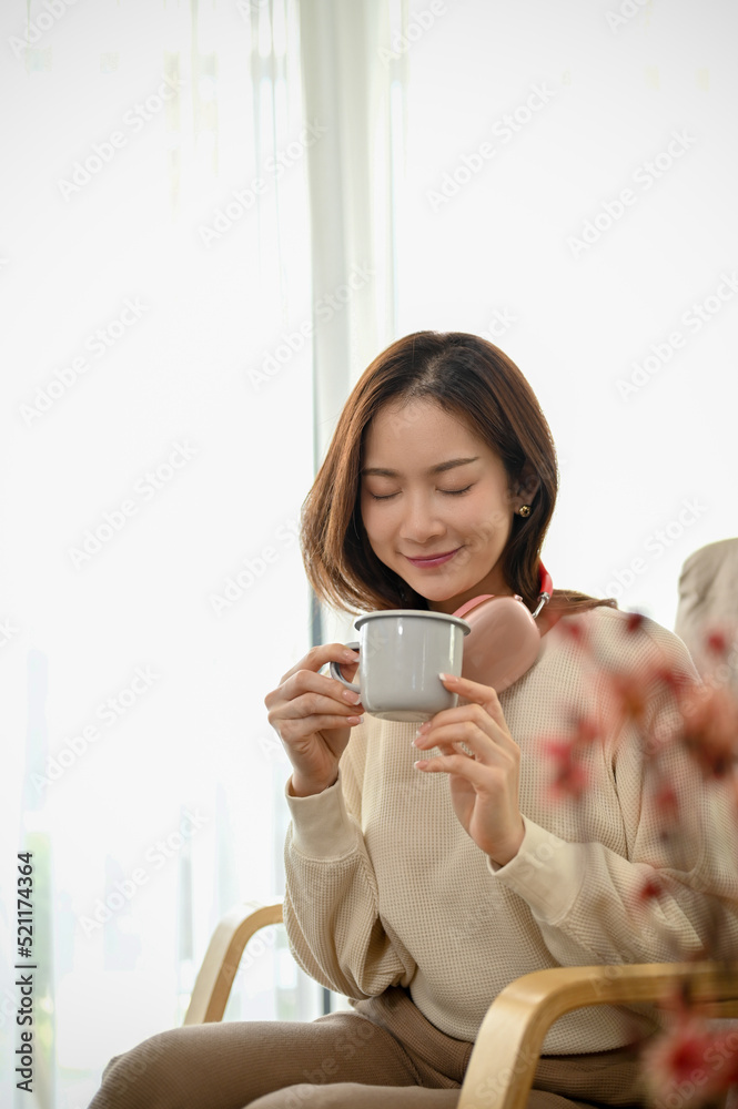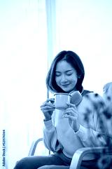 Charming young Asian female sits on a armchair in living room sipping coffee or tea to start her day