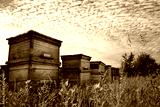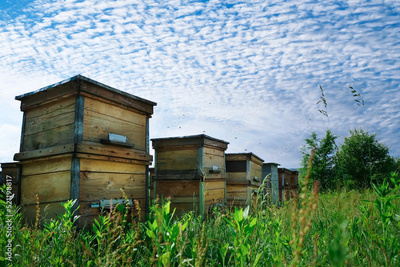 Apiary. Hives in an apiary with bees flying to the landing boards. Apiculture.