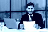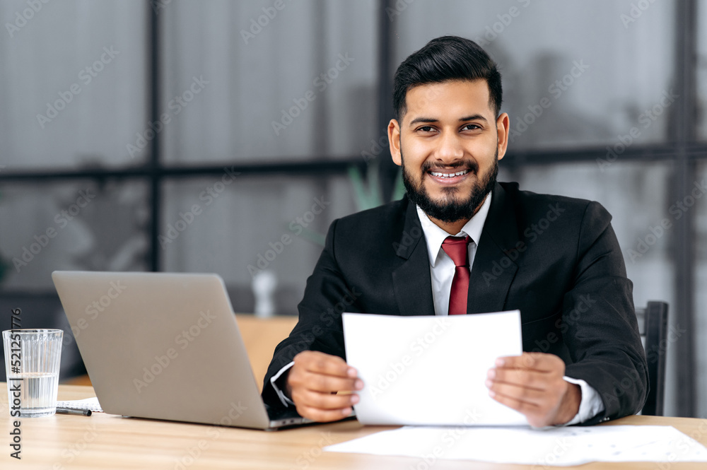 Positive handsome confident arabian or indian successful businessman, lawyer, assistant, in a formal suit, sit at work desk with laptop in modern office, holds document, looks at camera, smiling