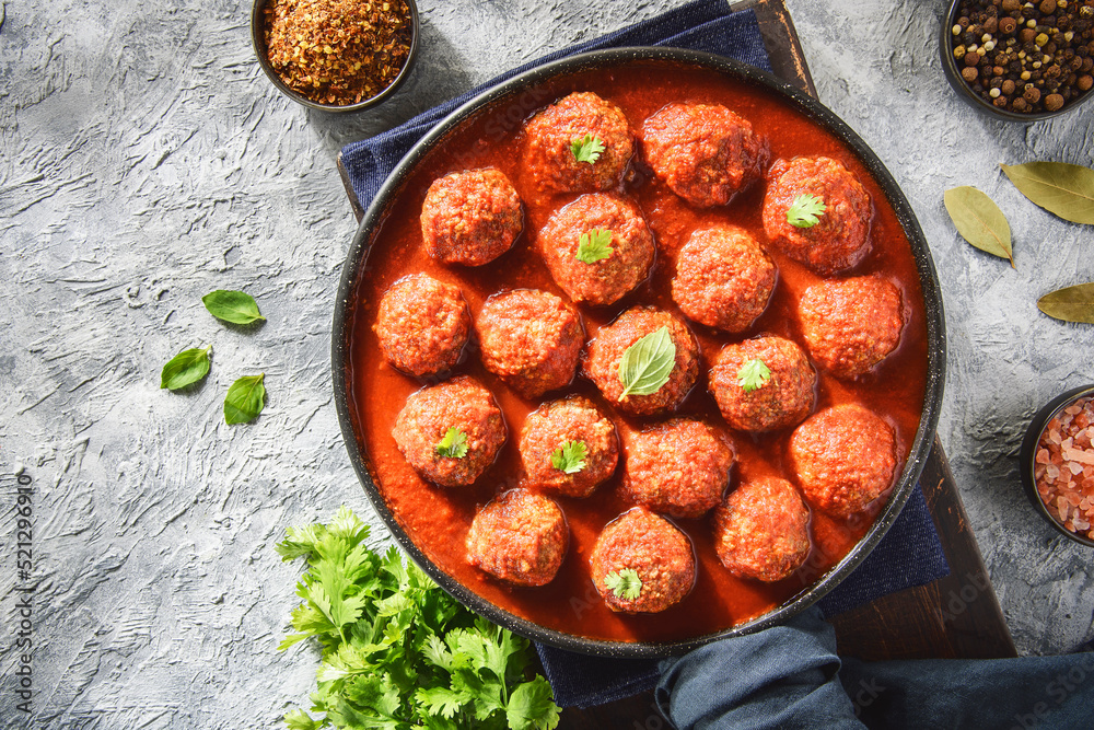 Middle Eastern traditional spiced meatballs in tomato sauce "Dawood Basha". Top view with copy space.