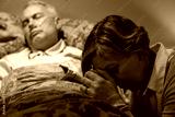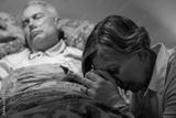 Uneasy senior woman praying for sick man