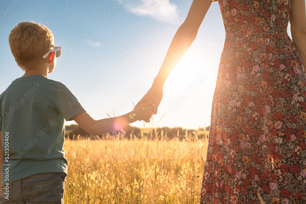 Mother and son holding hands in a field. Mother and son relationship concept .
