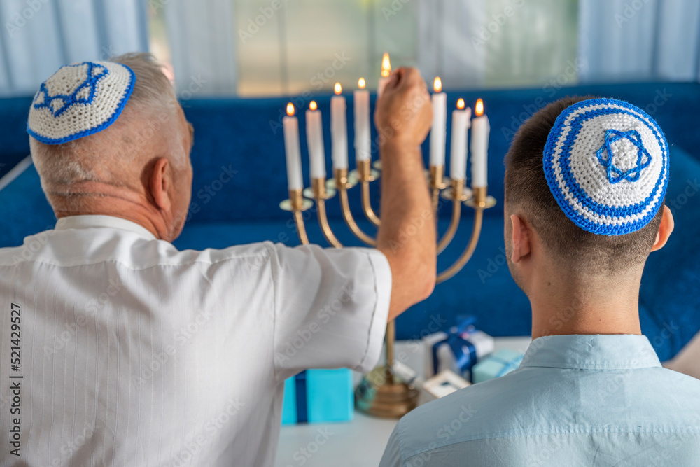 Hanukkah holiday. A senior man and young guy wear kippahs on heads in front of Jewish Hanukkah Menorah, lighting fire of candles. Yarmulke with Star of David. Traditional Hebrew Festival of Lights