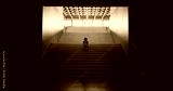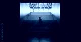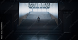 Lonely teen guy sitting on dark staircase alone. Schoolboy hiding in empty hall.