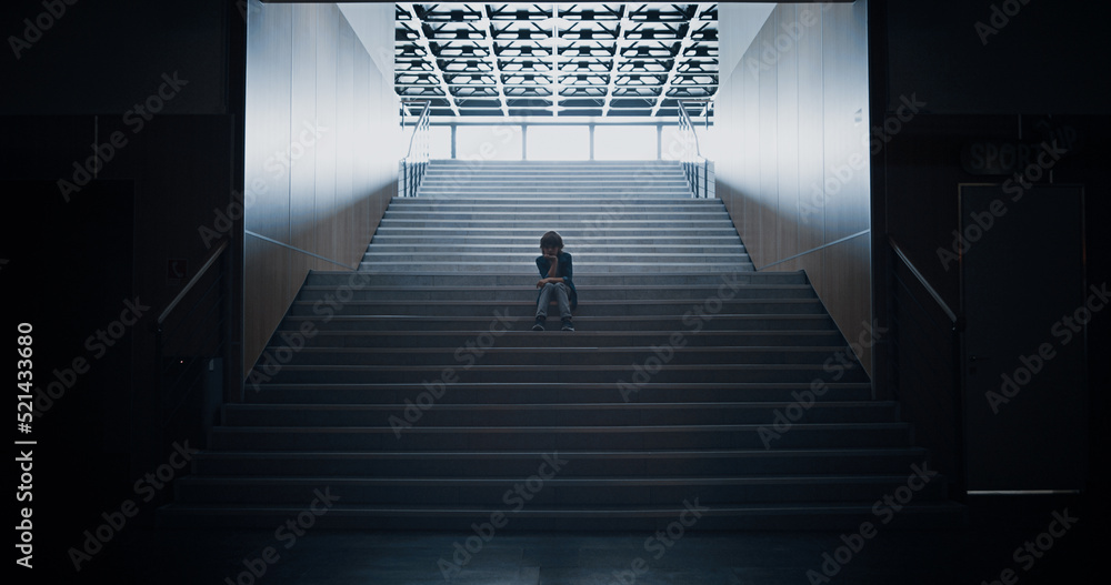 Sad teen boy silhouette sitting alone on stairway. Schoolboy feeling depressed.