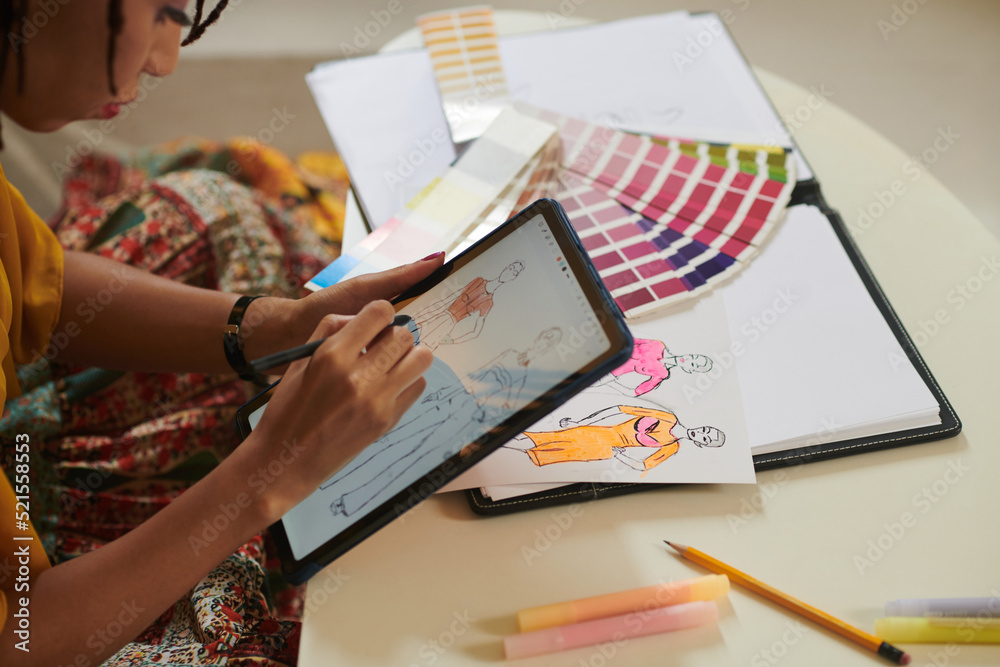 Fashion designer drawing sketches for new collection on tablet computer