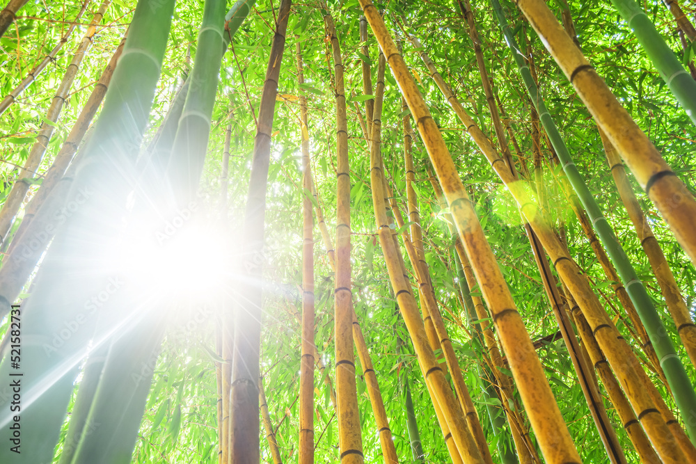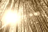Bamboo green forest and thickets with the bright light bright glare sunbeam of the sun rays, look at the top, eco texture.