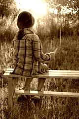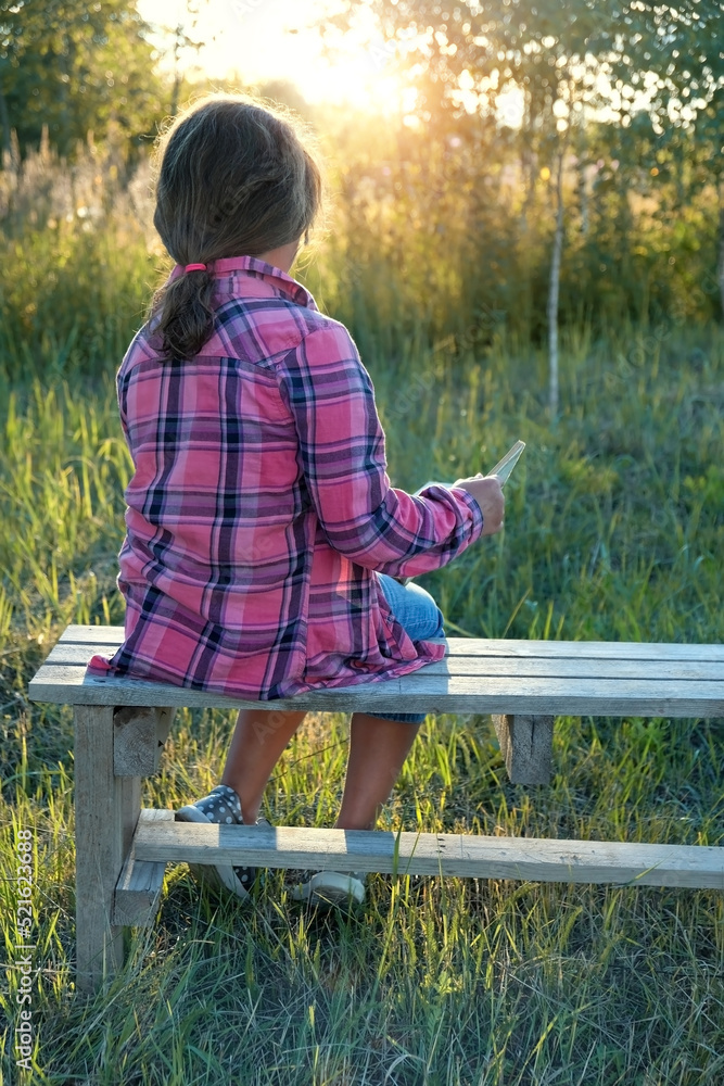 young girl sitting on bench and reading book outdoor, abstract sunny natural background. rear view. Child studying in summer garden. education, writing hobby concept