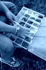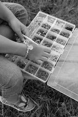 child and plastic container with set of accessories, tools, colorful rubber bands for weaving bracelets. Children's hobby for hand motor skills. trendy handmade