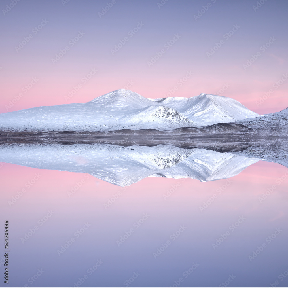Rannoch Moor and Black Mount reflection covered in snow during winter
