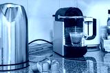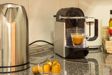 Glossy granite countertop with a pod coffee machine that brews an espresso next to a hard of water
