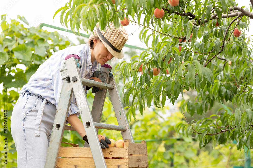 young woman farmer harvesting peaches from tree in garden. A woman stands on a ladder and puts peaches in a box