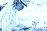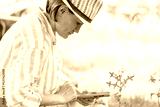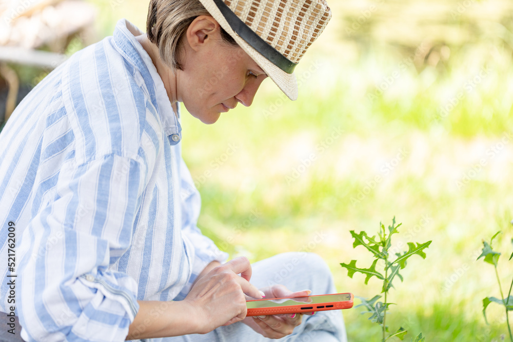 woman wearing in hat sitting in the park on the green grass with a smartphone
