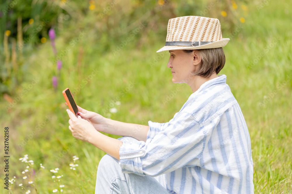 woman wearing in hat sitting in the park on the green grass with a smartphone