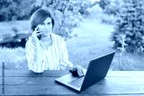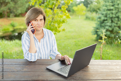 A woman works on the terrace of a wooden house, A girl looks into camera, Distance education, Freelancer works on the veranda of the house
