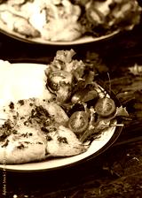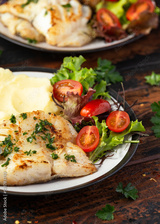 Fried cod loin fillet with mashed potato and vegetable salad served with fresh lemon