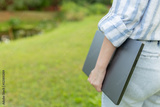 Back view of a woman who is standing with a closed laptop. Rear view people collection. backside view of person. Young engineer with a closed laptop in hand.