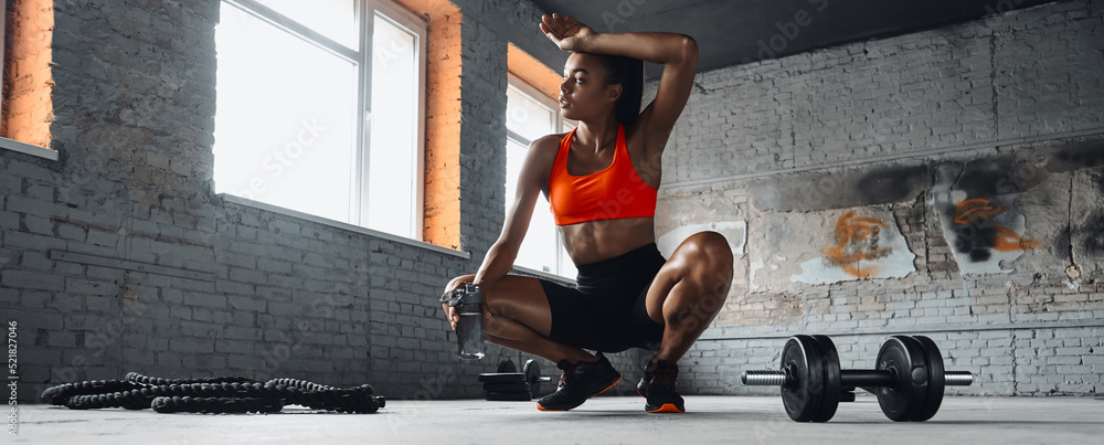 Tired young woman holding bottle with water and touching forehead while resting in gym